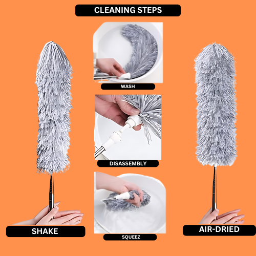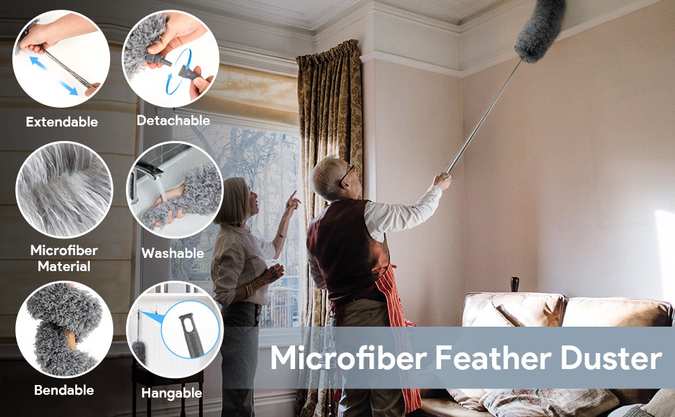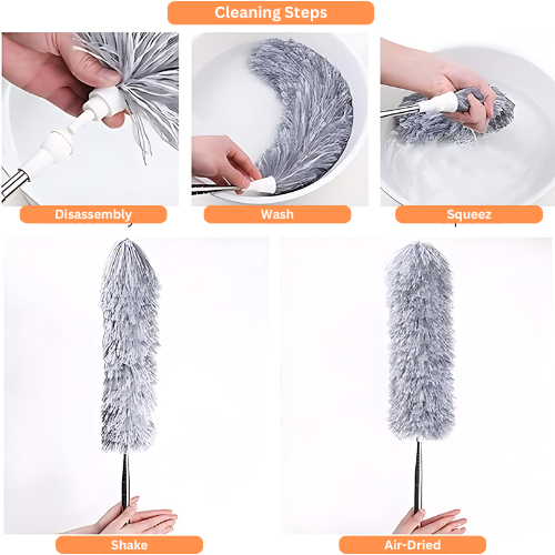 Washable & Detachable Microfiber Head: Made from high-quality microfiber, the head effectively traps dust and dirt. When it needs cleaning, simply slide the head off the pole and wash it by hand in warm water. The head is also detachable, making it easy to clean.