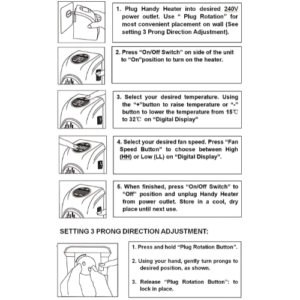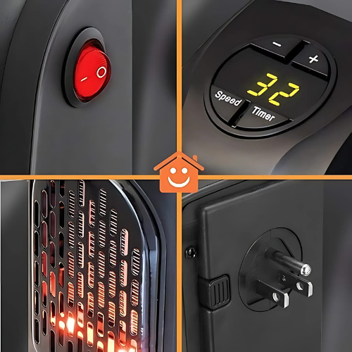- Additional Information: Digital LED Display. Programmable 12-Hour Timer Quick And Easy Heat – Instantly Plugs In And Turn On! Adjustable Thermostat 15c-32c Auto Shut Off Timer High & Low-Speed Settings Frees Up Floor Space. 181 Degree Rotation Plug Amazing Free up floor space since there are no messy cables! Overheat Protection of Fan Heater: PTC ceramic element is self-regulating With the design of over-heat protection for thermal control. It is an air blower heater which has an inbuilt fan to throw air.